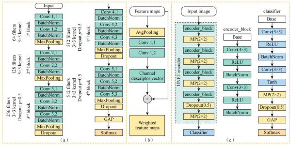 姿态估计和姿态预测在智能助行器上已有大量实践。如为比较不同算法处理RGB−D视频序列的效果,Gonçalves等研究了3种不同的基于深度学习的算法,分别使用了改造过的VGG16模型(图6(a))、结合通道级注意力的CNN模型(图6(b))、适用于单帧分类的UNET模型(图6(c))。