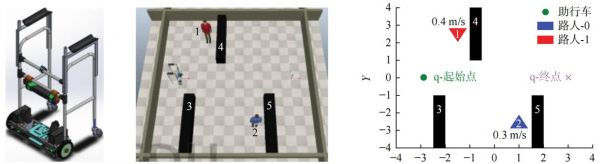早期的智能助行器采用了传统的环境检测方式。近年来,智能助行器的环境识别借鉴了自动驾驶的有关技术,通常通过摄像头捕捉周围环境的图像,以及使用激光雷达创建周围环境的精确三维地图。每种算法都有其特定的应用场景和优缺点。如Lima等提出了一种改进版本的概率泡沫法,以应用于动态环境中智能机器人助行器的路径规划,设备及实验场景如图8所示。实验结果表示该算法可在静态障碍物中规划路径指引用户前往目的地,同时规避与路径交叉的其他移动障碍物。