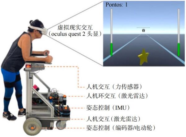 近年来,虚拟现实技术(VR)已被越来越多地与助行系统结合起来使用,以求为用户提供安全保障与康复训练。如Franchine等的研究证明,使用虚拟现实技术可以有效提高用户尤其是有认知障碍的用户的训练积极性,改善人机交互的结果,实验设备及场景如图10所示。但现阶段,依托虚拟现实的智能助行器人机交互相关研究仍处在实验室探索阶段。