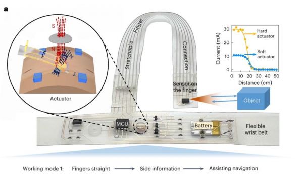 更精妙的是这一系统加入了触觉维度:通过开发可拉伸的传感-运动人工皮肤A-skin贴片,供用户佩戴在手腕和手指上,提供额外的导航辅助。