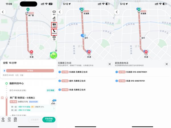 图片依次为查询地铁站内无障碍卫生间、沿途无障碍卫生间信息、站内求助电话
