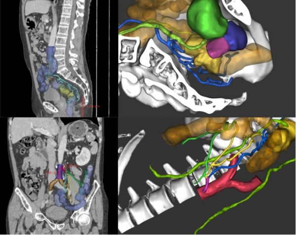 基于CT/MRI等影像数据,对病灶及血管、输尿管、神经等关键结构进行三维重建,以更直观的方式辅助医生理解复杂解剖关系,为术前评估和术中参考提供支持。