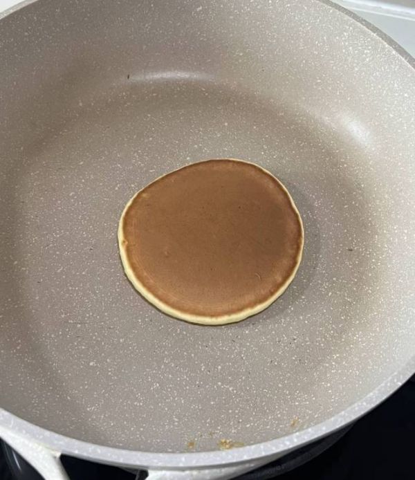 待锅体加热至适中温度时,使用勺子舀取适量面糊,轻轻地倒在锅面上,每次一勺,形成圆形面团。当面团边缘开始凝固,表面出现大量泡泡并且开始破裂时,说明底部已熟,此时可以小心翻面,继续煎至两面呈现金黄色。