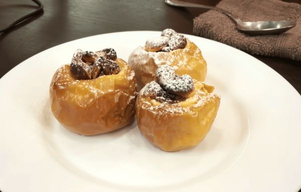 Сначала яблоки вымачивают в различных сиропах и сладких отварах. Затем вырезают сердцевину, наполняют сладкой начинкой и запекают. Запеченное с орехами, медом или другим наполнителем яблоко – полезная сладость, которая богата калием и железом.