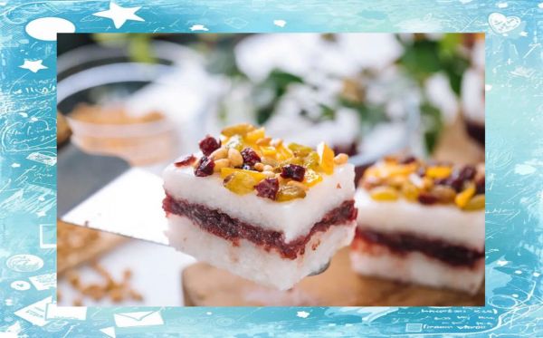 准备一个9寸的方盘,先在底部和四周铺上油纸,之后铺上一层糯米饭泥,再铺上蔓越莓泥,最后再铺上一层糯米饭泥并抹平。