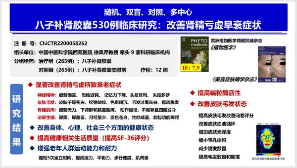 吴以岭院士指出,中国中医科学院西苑医院带领8家临床中心开展的“八子补肾胶囊抗衰老随机、双盲、安慰剂对照、多中心临床研究”证实,八子补肾胶囊能够显著改善衰老人群的衰老症状,改善躯体、心理衰老状态,提高生活质量,增强老年运动能力和耐力,显示出中医药在抗衰老领域的独特优势。