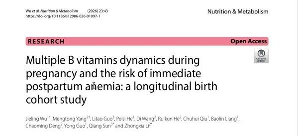 近日,汤臣倍健依托自建的干血斑检测平台,联合广东省妇女儿童医院、加拿大多伦多大学在精准营养领域取得新成果:研究发现孕中期维生素B1与B3水平较高的孕妇,产后发生贫血的风险更低。该成果发表于国际权威期刊Nutrition & Metabolism,首次系统揭示了多种B族维生素与产后贫血的关联,并成功构建产后贫血早期风险预测模型,为产后贫血的提前预警与精准干预提供了科学工具。