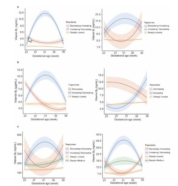 图:从妊娠中期至产后48小时母体血液中B族维生素浓度变化轨迹