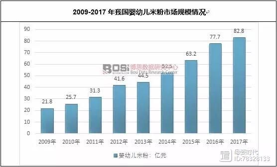 有关统计数据显示,婴幼儿米粉占据辅食产品销量的半壁江山,2012年市场规模为41.6亿元,到2015年营养米粉市场的销售额已达63.2亿元。2017年则达到了82.8亿元。