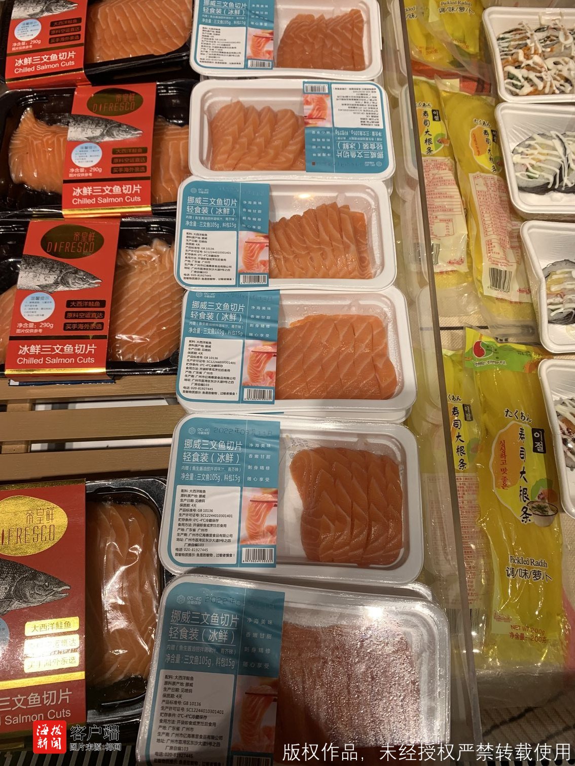 对于轻食最近火爆,记者也于近日走访盒马鲜生超市以及部分罗森门店。在盒马鲜生超市的熟食区内,一盒盒搭配好的轻食餐摆在轻食柜内,生产日期均为当日现做,价格在12-27元不等,每盒的食材搭配不同,鲜艳色彩配菜带上淡色系的食材,可谓浓妆淡抹总相宜。在一个冷鲜柜内,记者注意到三文鱼也被作为轻食的一种。