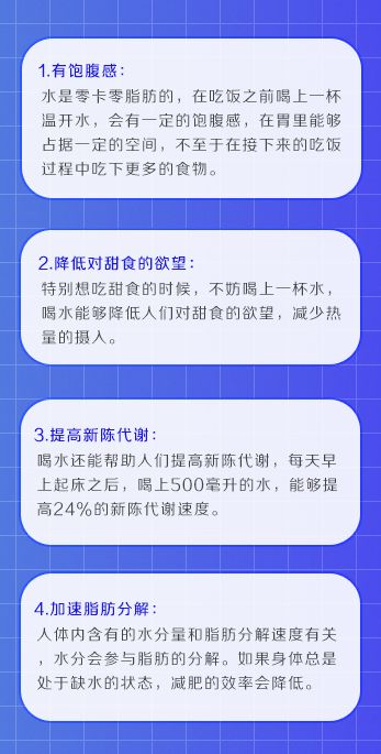 4、加速脂肪分解:人体内含有的水分量和脂肪分解速度有关,水分会参与脂肪的分解。如果身体总是处于缺水的状态,减肥的效率会降低。