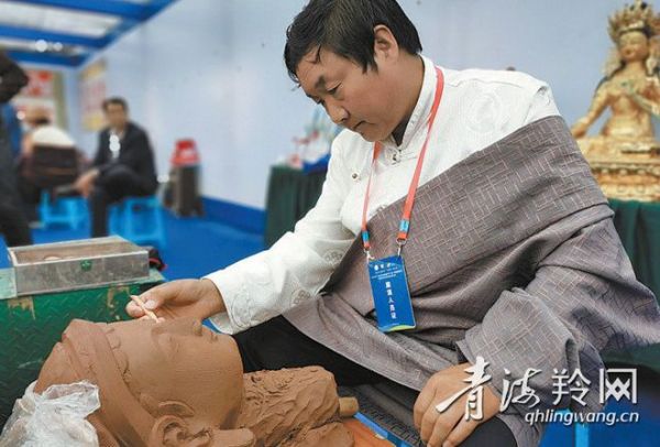 热贡泥塑非遗传承人尕藏才让正在制作泥塑作品。 方俊阁 摄