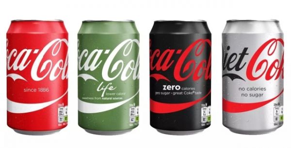 ▲从左数,经典可乐、Coca-cola Life、零度可乐、Diet Coke,不过零度可乐已经停产