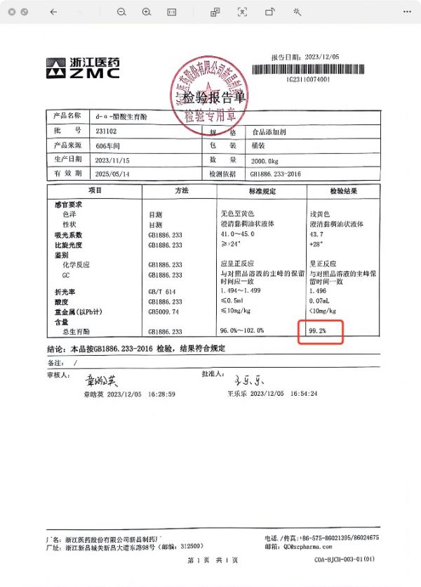 △来益维生素E软胶囊99.2%高纯度检验报告
