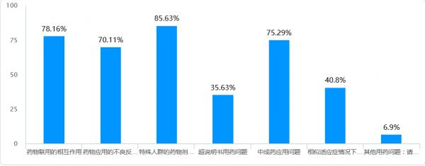 调研显示,在治疗过程中,医生们最关注的是“特殊人群的药物剂量问题(包括老年、肝肾功能不全等)”为85.63%,其后依次为“药物联用的相互作用”78.16%、“中成药应用问题”75.29%、“药物应用的不良反应防治”70.11%、“相似适应症情况下的潜在重复用药问题”40.8%、“超说明书用药问题”35.63%。