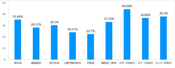 调研显示,在糖尿病患者的治疗中,关于COVID-19合并糖尿病患者的降糖药应用方面,医师对不同种类降糖药物存在用药困惑的情况为,最高的药物为“DPP-4抑制剂”44.8%,30%-40%之间的有五种,分别为“SGLT2 抑制剂”、“GLP-1抑制剂”、“胰岛素”、“噻唑烷二酮类”、“格列奈类”,20%-30%较低用药困惑的有三种,“磺酰脲类”、“α糖苷酶抑制剂”、“双胍类”。