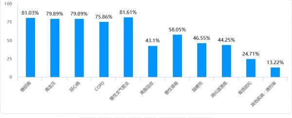 如今,新冠肺炎成为所有人关注的重点,因此不少医院的门诊部关闭,部分慢性病患者的用药需求难以得到满足。 而对于参与调研的疫情防控一线医师来说,除新冠肺炎以外,还需关注患者的其它慢病或基础性疾病中五种疾病占比较高:其中慢性支气管炎为81.61%、糖尿病为81.03%、高血压、冠心病均为79.89%、COPD为75.86,其后依次是慢性肾炎、脑梗死、消化性溃疡、高脂血症、骨质疏松。