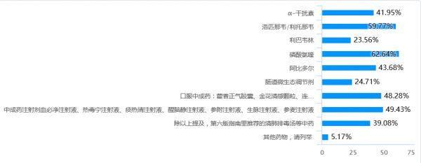 调研显示,针对新版新冠病毒治疗指南中的药物 ,医生们最希望了解的药物为“磷酸氯喹”62.64%,其次为“洛匹那韦/利托那韦”59.77%,再后依次为“中成药注射剂血必净注射液、热毒宁注射液、痰热清注射液、醒脑静注射液、参附注射液、生脉注射液、参麦注射液”、“口服中成药:藿香正气胶囊、金花清感颗粒、连花清瘟胶囊 (颗粒)、疏风解毒胶囊 (颗粒)”、“阿比多尔”、“α-干扰素”等。