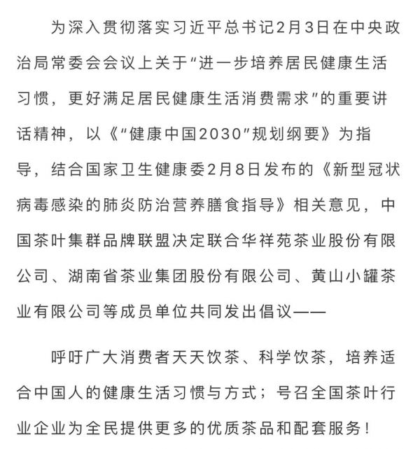 作为中国茶叶行业的从业者,我们将坚决响应国家号召,提升食品安全主体责任意识,为消费者提供优质、安全、放心产品;将通过不断拓宽渠道,不断丰富茶叶产品品类,满足消费者的多元化需求;将以守正创新的生产观念、产品观念、营销观念、客户观念,大力开发自饮茶、办公茶、民生茶,不断满足人民群众的生活消费需求,塑造中国茶品牌的良好形象;通过主动普及科学、健康的饮茶知识,让更多人懂喝茶、爱喝茶、会喝茶,真正享受健康时尚的美好生活。