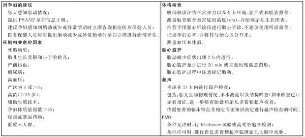 指南指出:①当孕妇提出胎动减少时,应尽快(最好2 h内)进行孕妇和胎儿状况的评估(证据等级:Ⅲ-3/B);②应评估胎动减少孕妇是否存在增加死胎风险的其他危险因素(证据等级:Ⅲ-3/C),若合并危险因素,应视为高危妊娠加以管理。