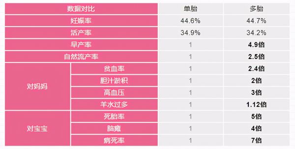 从上表可以明显看出,无论是对于母亲还是胎儿,多胞胎比单胞胎更具有风险性:多胞胎妈妈在怀孕期间更容易出现贫血、高血压等妊娠期综合症;同时,产后出血、新生儿早产、先天缺陷等概率也会相对提高。这些危险情况出现,都会给医生和患者带来了很大的挑战,处理难度大、风险大,有的患者往往一个也保不住,为此付出惨痛的代价。
