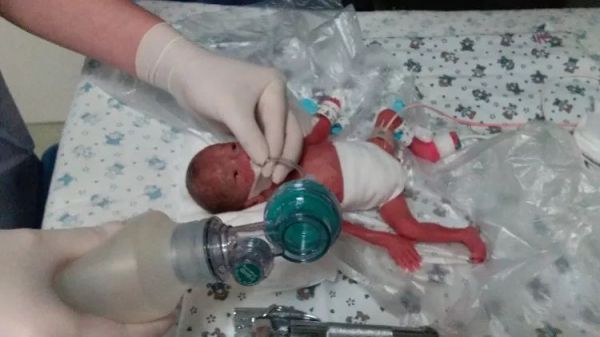 每过多久,随着一声微弱的啼哭,孕妇顺利娩出一巴掌大男婴,皮肤还呈胶冻状,无法正常呼吸,面色发绀,心率仅为正常新生儿一半,争分夺秒抢救开始,迅速恢复通气,心率升至正常。约10分钟后她娩出另一更“迷你”的小男婴,啼哭更微弱,当时看着只有豆腐块般大小的生命,大家心里都倒吸一口冷气,即刻进行紧张有序的复苏.....
