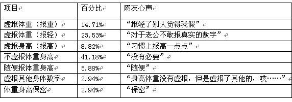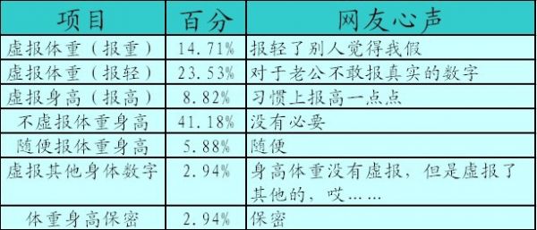 就网友中的女性而言,现在女性的低位得到了越来越多的重视和提升,人们不再需要用一些很虚幻的数字来装饰自己,女性开始由内而外地注重除了外貌体型数字之外的东西,如学历、品质等,从而出现了除美貌、漂亮之外的形容女性的词,如智慧、善良、知性、气质、温婉、大方等,因为女性对于自己的身高、体重、胸围、臀围等数字不再如以前的那般在乎,也并不需要通过这么数字来提升自己,从而出现了更多的觉得“虚报体重,没有这个必要吧”,“我从来不虚报身高和体重”,“随便啦”等网友心声,我们应该为之感到骄傲和开心。