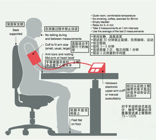 1)应在安静、温度适宜的环境中进行测量,最好休息 ≥ 5 分钟,排空膀胱,不在饮酒、喝茶或咖啡以及抽烟后测量血压,避免被测量者出现紧张、劳累、焦虑等情绪。