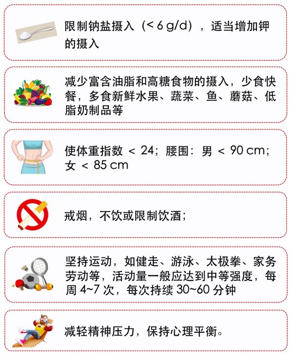 其中,生活方式干预对降低血压和心血管危险因素的作用肯定,所有患者都应采用,主要措施包括: