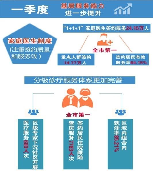 分级诊疗服务体系更加完善,促进区内医疗资源互动。今年一季度,60名区级专家下沉社区开展医疗服务680人次,签约居民住院跟随查房服务7783人次,区域内组合内就诊率85.21%,位居全市第一,微信服务号预约4479人次,家庭医生门诊预约69人次。