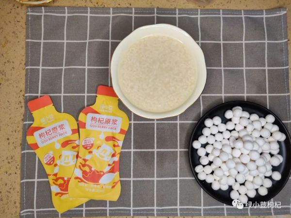 1.250ml水烧开,放入一盒米酒,两袋绿小豆枸杞原浆,迷你汤圆,根据个人口味适量加一点糖或是加鸡蛋;