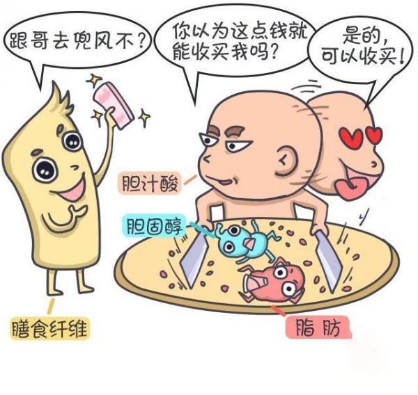 消化液中的胆汁酸,由肝脏分泌的,能促进我们人体对脂肪、胆固醇的吸收,而食物纤维中有些成分,如果胶可与胆固醇结合,木质素可与胆酸结合,使其直接从便粪中排出,从而消耗体内的胆固醇来补充胆汁中被消耗的胆固醇,由此降低了血脂。有助于减少冠心病的发生。