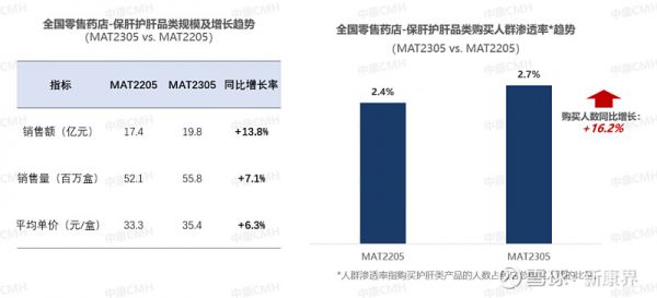 中康CMH数据显示,保肝护肝品类在全国零售药店的市场规模在过去三年(MAT2105、MAT2205、MAT2305)保持快速增长,增速相比新冠疫情爆发之前明显加快。