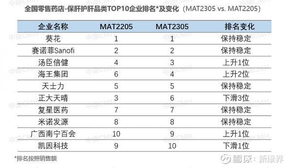 根据中康CMH监测数据,护肝品类在零售药店的企业数量达300多家,其中规模最大的前十企业贡献总体约80%市场份额。葵花、赛诺菲稳定占据第一和第二厂家位置,汤臣倍健和海王集团目前位居第三和第四厂家位置,且排名均有所上升。