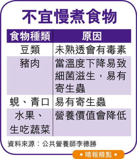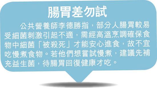 慢煮的另一方式,是将食材放入“慢煮锅”中加水长时间烹煮。李指,此法能消灭微生物,惟烹调温度若太低及时间太短,亦难以杀菌。