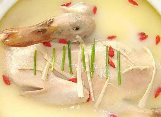 做法:将老鸭洗净切块,放入锅中,烧开后撇去浮泡,转中小火烧4小时,将所有中药材用热水泡软后洗干净,放入熬制好的老鸭汤中,加调料、笋丝,烧开即可食用。