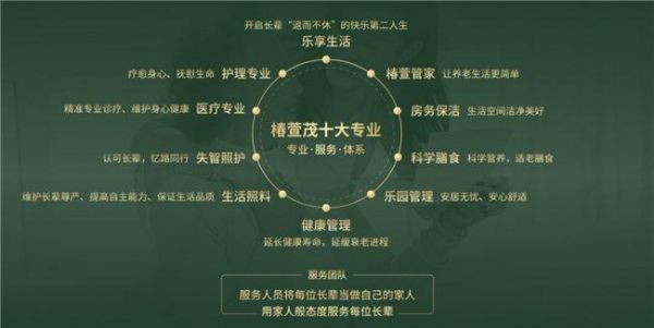 作为中国高品质健康养老服务的践行者、国际先进健康养老理念的引进者、互联网+健康养老落地实施的先行者,椿萱茂致力于让长辈享受健康快乐、自由自主、共享幸福的新生活方式。为此,椿萱茂兼顾软性的家文化与高品质的服务,打造包括健康养老服务、居家及社区服务、医疗护理服务、短期照顾服务、健康养生服务、日间照料服务、旅居生活服务在内的7大产品,以及提供健康管理专业、生活照料专业、失智照护专业、医疗专业、护理专业、乐享生活专业、椿萱管家专业、房务保洁专业、科学膳食专业、乐园管理专业十大专业服务,涵盖229项服务内容。