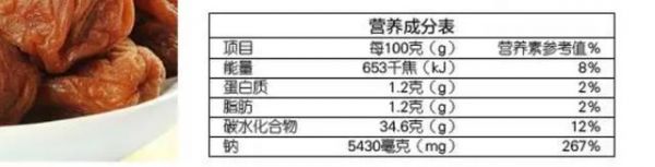 营养成分表里显示:每100克盐津话梅,热量653千焦,碳水化合物34.6克,钠5430mg即5.43克。