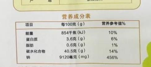 营养成分表里显示:每100克盐津话梅,热量854千焦,碳水化合物40.5克,钠9120mg即9.12克