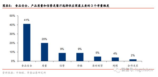 根据中物联冷链委餐饮供应链调查问卷,餐厅最看重的前3要素是:食品安全(41%)、质量(20%)和信誉(9%)。