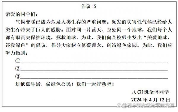 (3)班委会决定以八(2)班全体同学的名义,向全校师生发出“践行低碳生活”的倡议。请你把下面的倡议书补充完整。(3分)