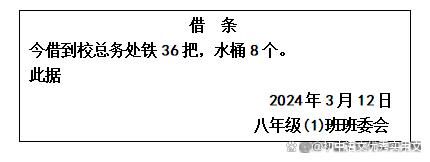 (3)为了强化低碳生活的理念,班级参加了植树活动。班委会2024年3月12日向学校总务处借了36把铁锹,8个水桶。下面是班长写的借条,请你帮他修改。(4分)