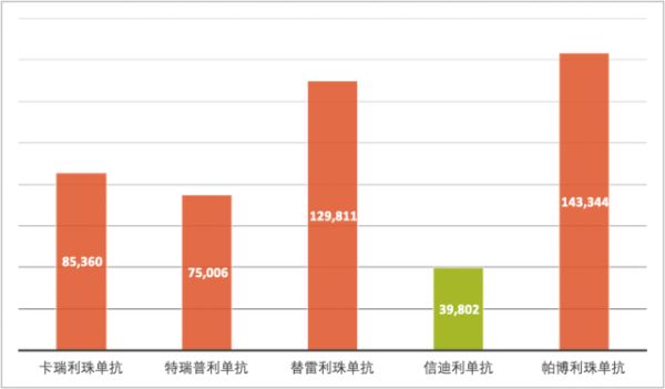年治疗费用:君实微弱优势领先在对免疫治疗效果有了初步的判断后,如果从中受益决定继续使用免疫治疗,那么年治疗费用就是下一个患者需要考量的经济门槛。从下图中我们可以看到,君实的特瑞普利单抗以28800的微弱优势领先,恒瑞医药的卡瑞利珠单抗和信达的信迪利单抗以3万多不及4万的价格紧随其后。
