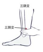 5、三阴交位于内踝上3寸,胫骨后缘凹陷中。用拇指或中指、食指的罗纹面着力,稍用力按揉。