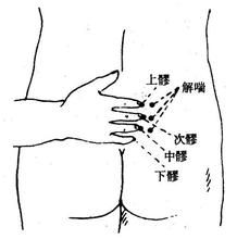 4、八髎位于骶骨第一、二、三、四对骶后孔处。用手掌面擦至局部发热,称擦八髎。