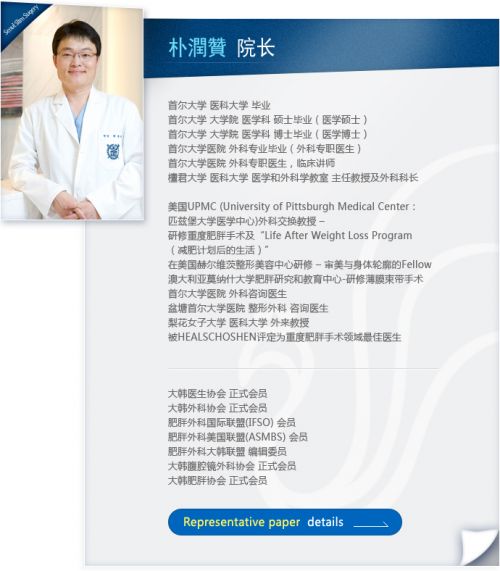 韩国首尔slim外科朴润赞院长韩国最高学府首尔大学医科大学博士,随后他作为美国 UPMC (University of Pittsburgh Medical Center)外科交换教授进行了高度肥胖手术及“Life After Weight Loss Program(减肥后体型维护项目)” 研修,300多例减肥手术成功案例足以证明手术是案例和技术是值得信赖的。