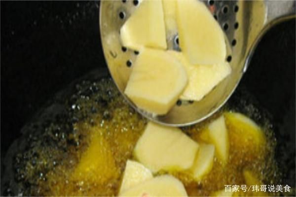然后我们将炒锅置于中火之上加热,倒入食用油,待油温烧至七成热时,放入土豆块炸至金黄色时,捞起沥油。这样土豆块在炒制的时候能更加快速的成熟,口感更加的酥糯。肉块预先用少许的酱油拌匀,再放入油锅,炸至金黄色时捞起沥油。