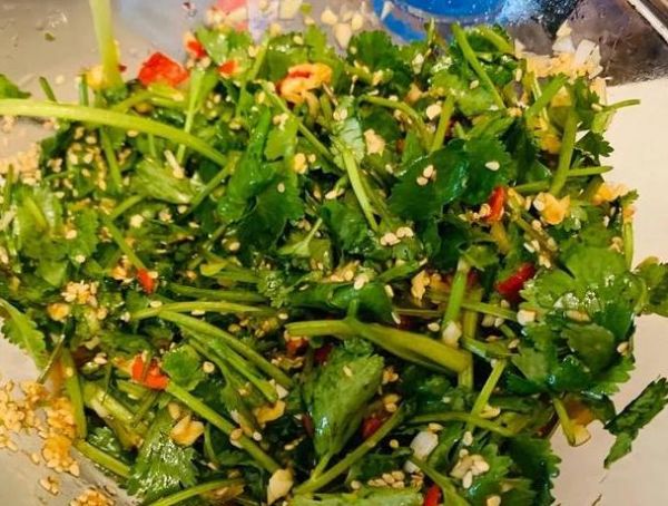 香菜味道鲜美,可以增添菜肴的风味。制作的凉拌香菜不仅美味可口,而且营养丰富。香菜中的矿物质和维生素能够补充人体所需的营养,搭配花生粉则提供了蛋白质和脂肪,是一道高营养、健康美味的凉菜。