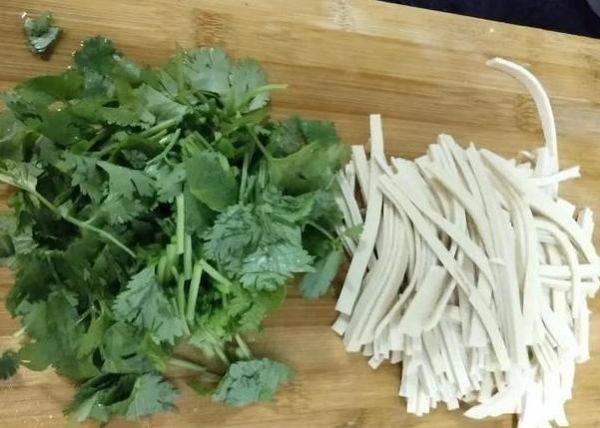 2.切割食材:将香菜洗净切成小段,千张切成细丝,花生米研磨成粉末,大蒜切末备用。