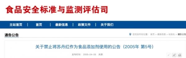 苏丹红是一种工业染料,由于动物实验发现其具有致癌性,我国、欧盟等地禁止将其用于食物生产。国际癌症研究机构(IARC)把苏丹红认定为三类致癌物,但不能确定它会不会让人得癌症。2005年卫生部曾向社会发布公告(2005年第 5 号),不得将苏丹红作为食品添加剂生产、经营和使用。